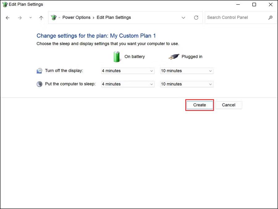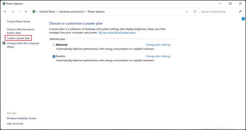 Stap 5:Uw bestaande energieplan zou op dit punt zichtbaar moeten zijn. Selecteer in het linkerdeelvenster Een energiebeheerplan maken.