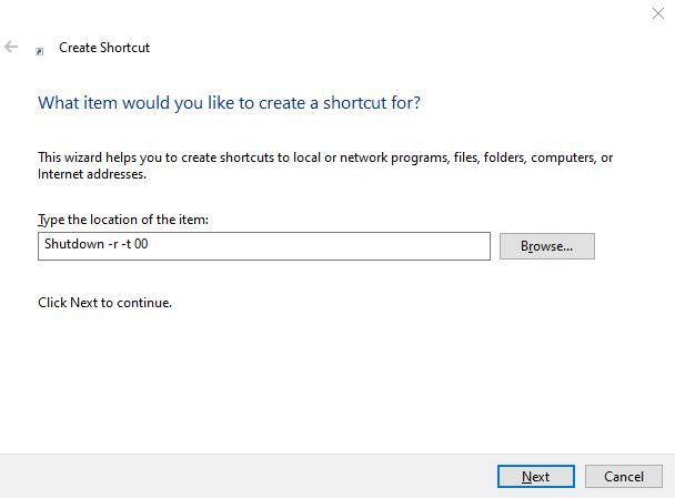 Stap 3:Nu wordt een nieuw snelkoppelingsvenster geopend, typAfsluiten -r -t 00in de tekstruimte en klik op de knop Volgende.