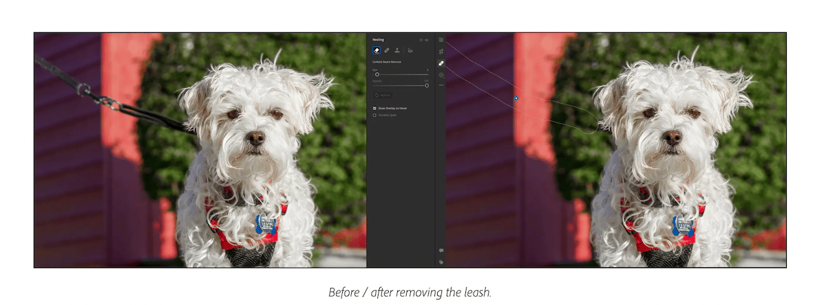 - Genezing met inhoudelijk verwijderFeature om afleidingen weg te vagen en automatisch verwijderde gebieden in te vullen. Beschikbaar op Lightroom voor Win/Mac, Lightroom Classic, ACR, iOS, iPados en Android.