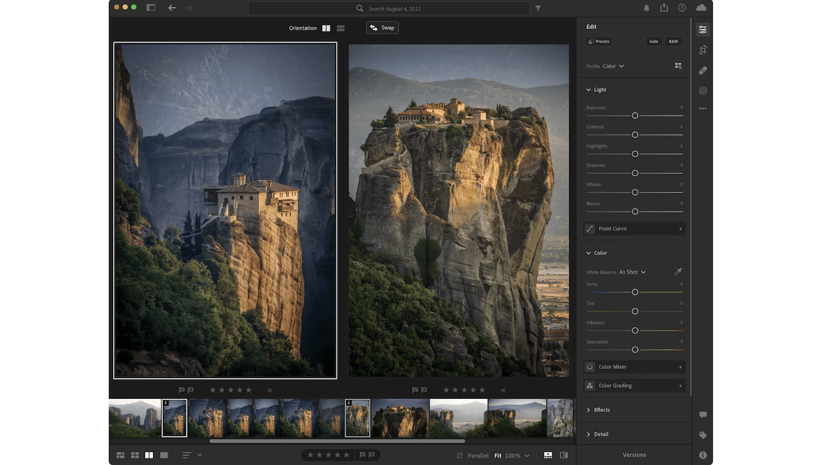 - Vergelijk tijdens het bewerkenom afbeeldingen naast elkaar te bewerken. Beschikbaar op Lightroom op Win/Mac.