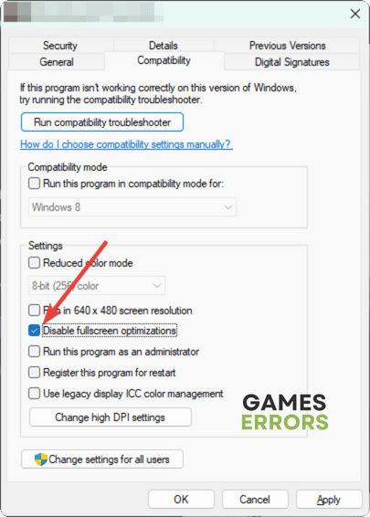Hoewel optimalisatie op volledig scherm nuttig kan zijn, kan dit in sommige games problemen veroorzaken. U moet het dus uitschakelen en kijken of het probleem met het oneindige laadscherm op After Us wordt opgelost. Hier zijn de stappen die u moet volgen: