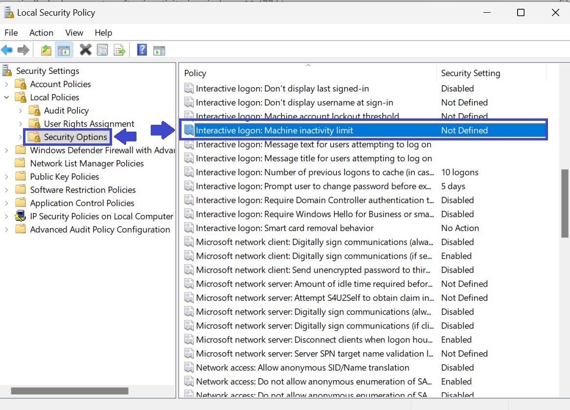 3. Klik in het rechterdeelvenster van Beveiligingsopties op Interactief aanmelden: Beleid voor limiet voor inactiviteit van machines.