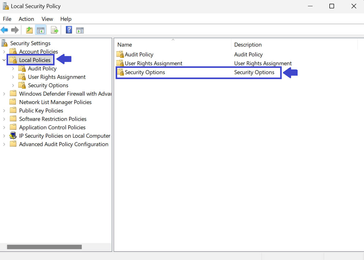 2. Ga naar Lokaal beleid en selecteer Beveiligingsopties.
