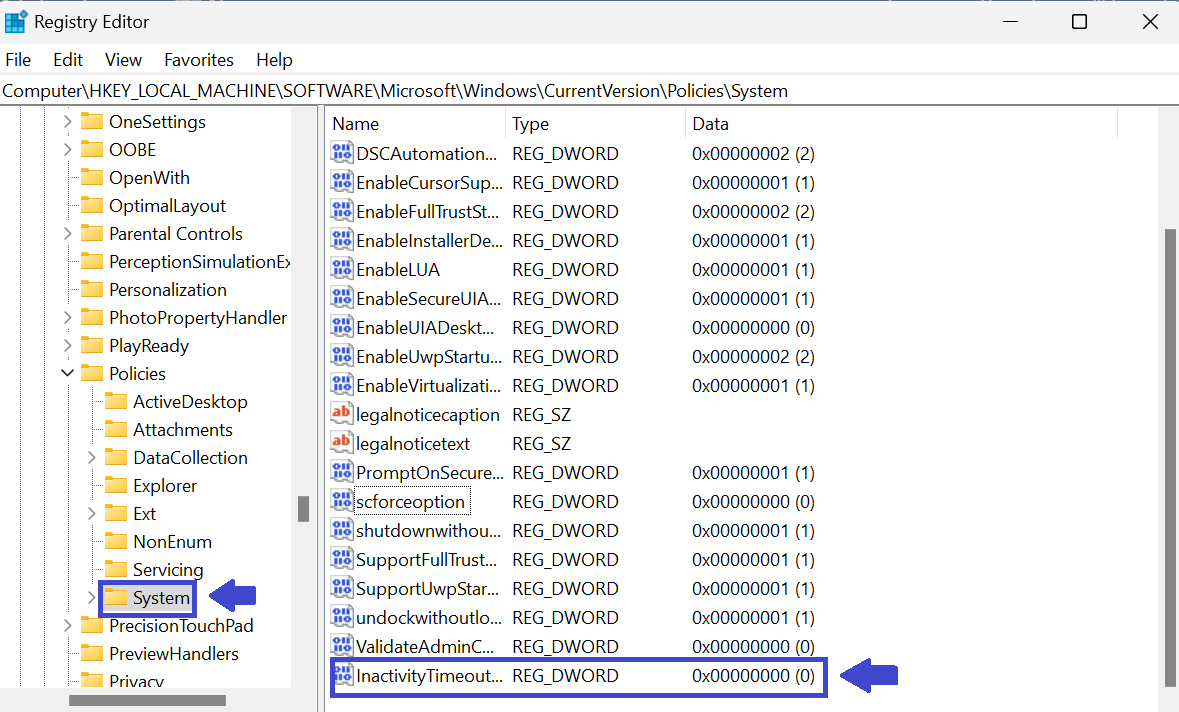 3. Klik in het rechterdeelvenster van de systeemsleutel op de InactivityTimeoutSecs-sleutel.