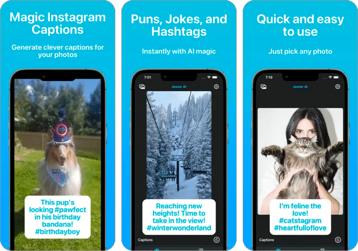 Bij Jester AI draait het allemaal om het gebruik van kunstmatige intelligentie om slimme, leuke en opwindende bijschriften voor je Instagram-foto's te maken. De eenvoudige, zeer intuïtieve interface van de Jester AI-app maakt het een van de beste ondertitelingsapps voor Instagram. Je hoeft alleen maar een foto te kiezen en naar de Jester AI-app te gaan. De AI analyseert de foto en stelt vier verschillende bijschriften samen die passen bij de sfeer van de foto die je hebt ingediend.