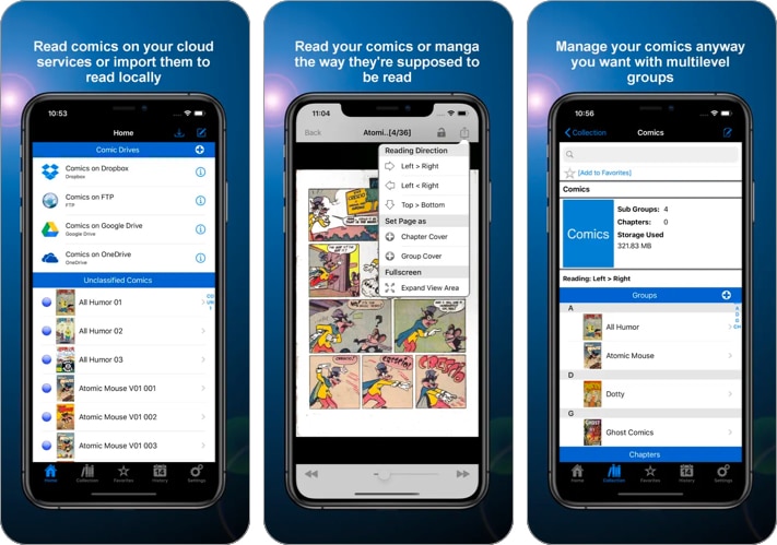 Deze app is een gratis manga-striplezer die DRM-vrije strips in CBR/CBZ/PDF-bestanden uit uw cloudopslag kan ophalen. Het importeert dus strips die je al in de cloud hebt naar je iPhone of iPad, zodat je ze gemakkelijk offline kunt lezen. U kunt het ook gebruiken om uw geïmporteerde strips te ordenen in mappen met meerdere niveaus ("stripgroepen" genoemd).