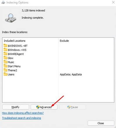 Stap 4.Selecteer Geavanceerd bij de prompt Indexeringsopties.