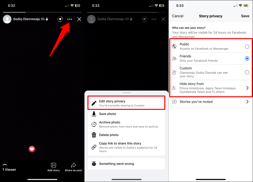 - Open je verhaal, tik op demenupictogram met drie stippenin de rechterbovenhoek en selecteerVerhaalprivacy bewerken