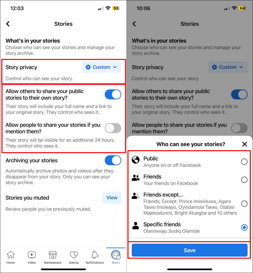 - Aangepast: Wil je verhalen delen met specifieke vrienden? Kies de aangepaste privacy-instelling en selecteer vrienden met wie u uw verhalen wilt delen.