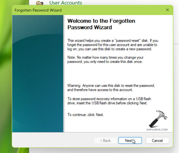 Nu wordt de wizard Wachtwoord vergeten geopend. Klik op Volgende. Als er geen USB-stick is aangesloten, kunt u niet op Volgende klikken. Sluit dus eerst een USB-stick aan.