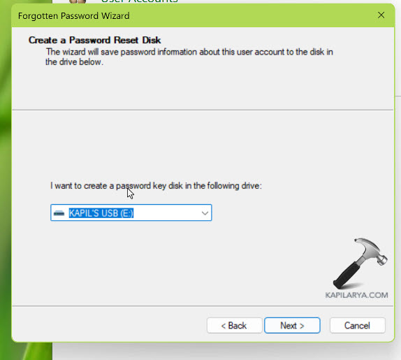 U moet uw huidige accountwachtwoord invoeren om de resetschijf te maken. Klik op Volgende.