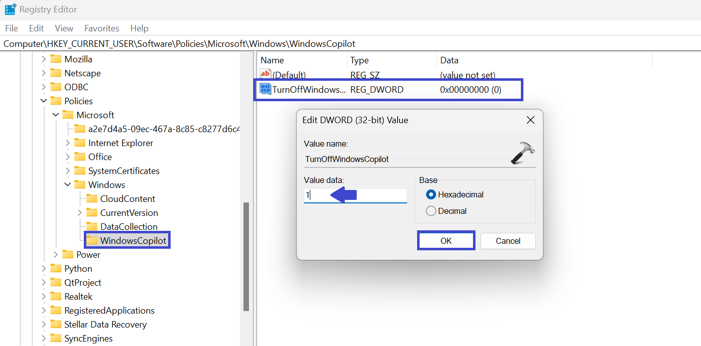 Zodra u deze stappen heeft voltooid, wordt Copilot in- of uitgeschakeld, afhankelijk van de optie die u heeft geselecteerd. U kunt altijd terugkeren naar de Register-editor om deze instelling op elk gewenst moment te wijzigen.