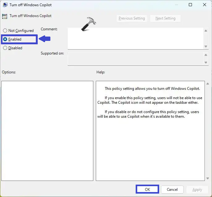 Selecteer “Inschakelen” om de Copilot op Windows 11 in te schakelen en klik vervolgens op OK gevolgd door Toepassen.