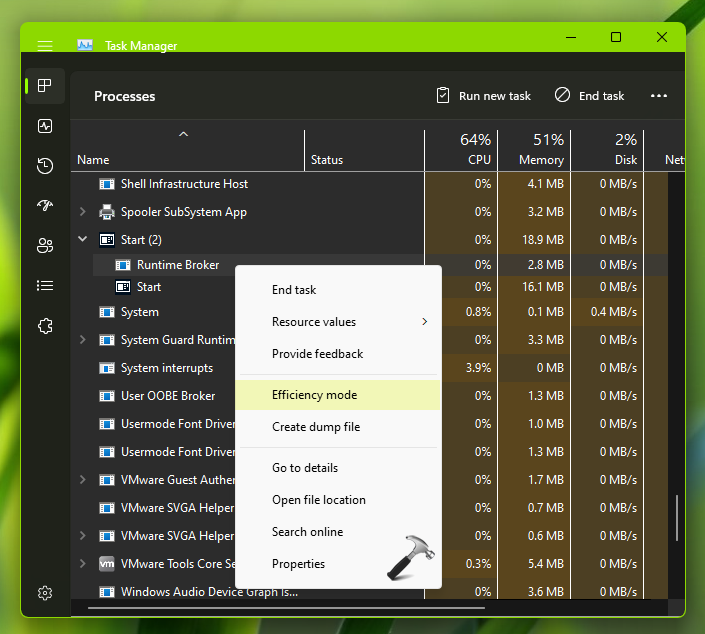 Als u later de Efficiency-modus wilt uitschakelen, klikt u met de rechtermuisknop op het proces terwijl deze functie is ingeschakeld en schakelt u de optie Efficiency-modus uit.