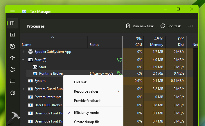 Hier ziet u hoe de Efficiëntiemodus eruit ziet in Taakbeheer wanneer u deze inschakelt: