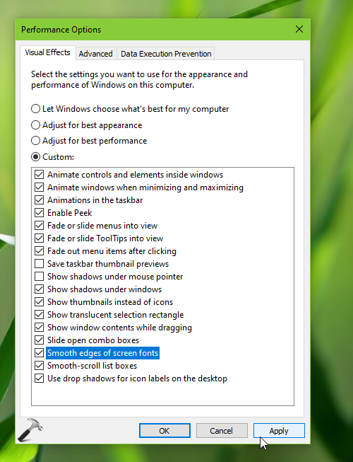 3.Selecteer vervolgens in het venster Prestatieopties op het tabblad Visuele effectenAangepast. Schakel vervolgens het selectievakje uitGladde randen van het schermlettertypeom het vloeiend maken van lettertypen in Windows 10 uit te schakelen. Of vink dezelfde optie aan om het vloeiend maken van lettertypen ingeschakeld te laten, wat ook de standaardinstelling is. KlikToepassen,OK.