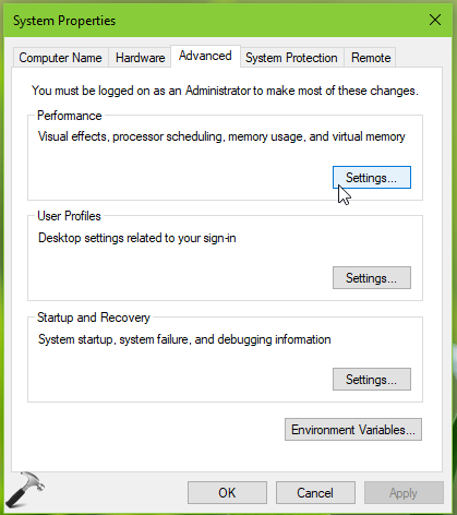 2.In het venster Systeemeigenschappen, aanGeavanceerdtabblad, klikInstellingenknop onder het kopje Prestaties.