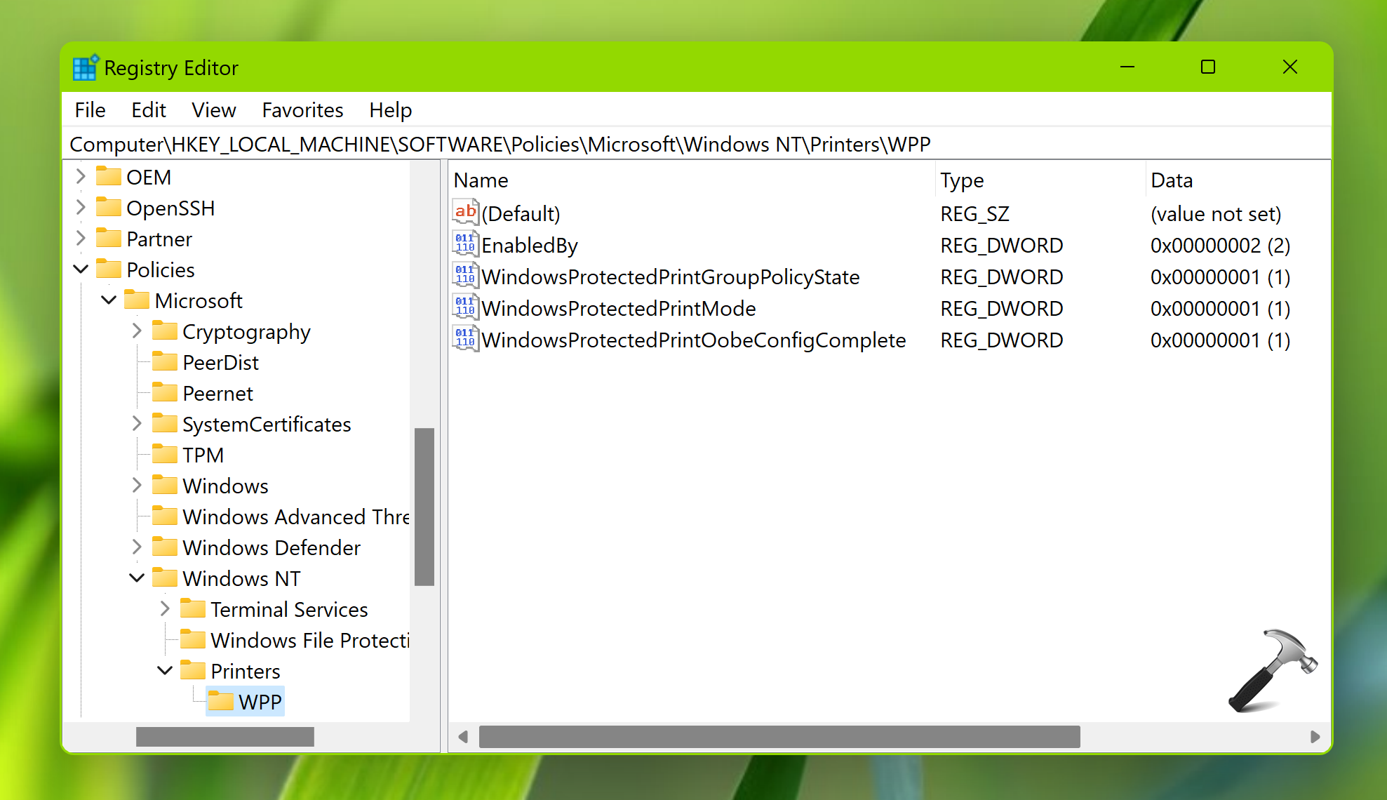 HKEY_LOCAL_MACHINESOFTWAREPoliciesMicrosoftWindows NTPrintersWPP