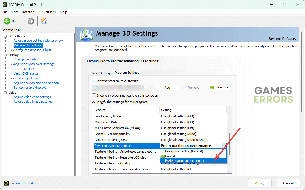 - Navigeer naar deBeheer 3D-instellingenen klik opProgramma-instellingen.