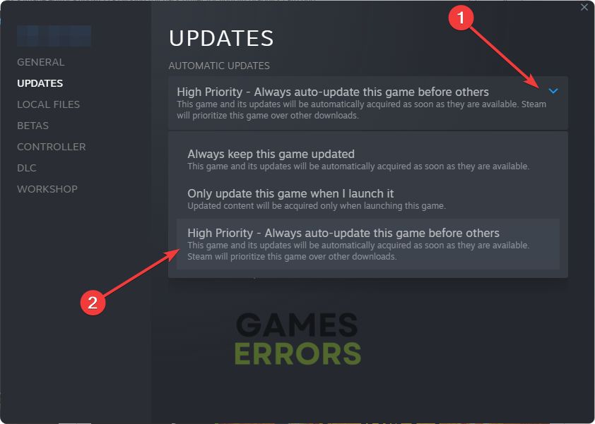 - Verander deAutomatische updatesnaarHoge prioriteit – Update deze game altijd automatisch vóór anderendoor op het vervolgkeuzepictogram te klikken.