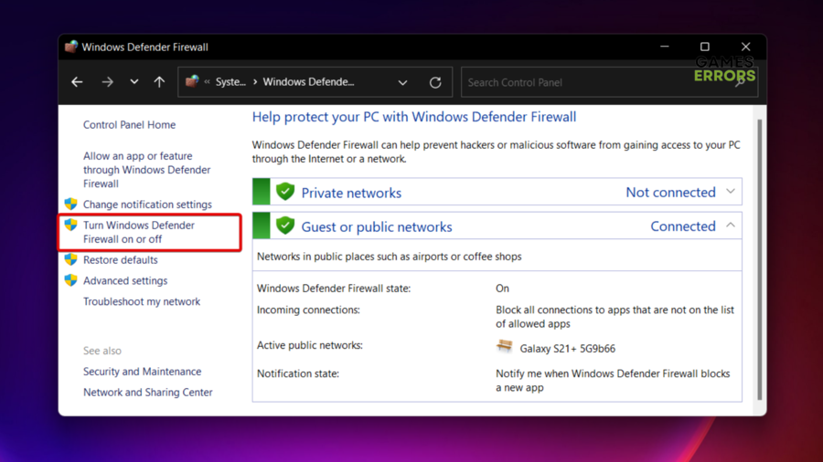 Als u nog steeds de geheugendumpfout of andere gerelateerde problemen krijgt, moet u de Windows Defender-firewall op uw Windows-pc uitschakelen. Volg de onderstaande stappen: