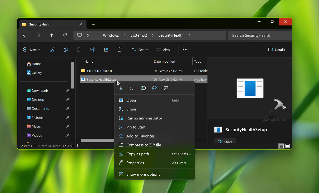 3. Insider SecurityHealth-map, die u zult vindenSecurityHealthSetup.exegenoemd bestand. Klik met de rechtermuisknop op dit bestand en selecteer Als administrator uitvoeren.