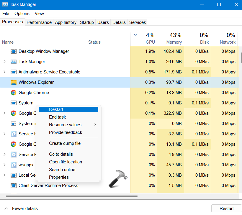 2.Ga naar deProcessentabblad en klik met de rechtermuisknop op hetWindows Verkennerproces. Kies vervolgensOpnieuw opstartenvanuit het contextmenu.
