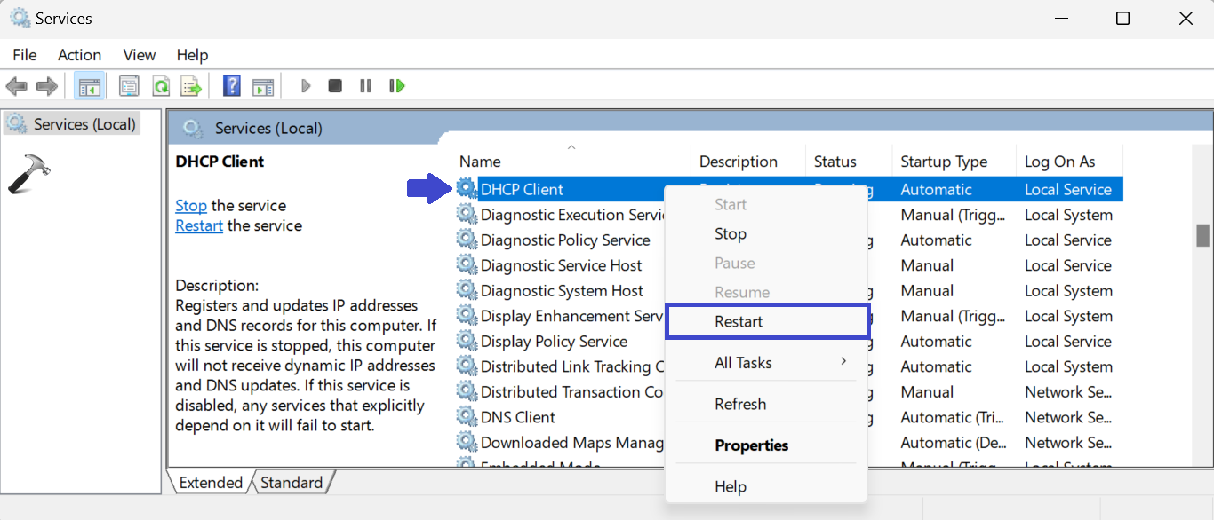 Als de netwerkadapter of de DHCP-clientservice niet actief is, kan uw computer geen verbinding maken met internet. Om dit op te lossen, kunt u proberen de netwerkadapter en de DHCP-clientservice opnieuw op te starten.
