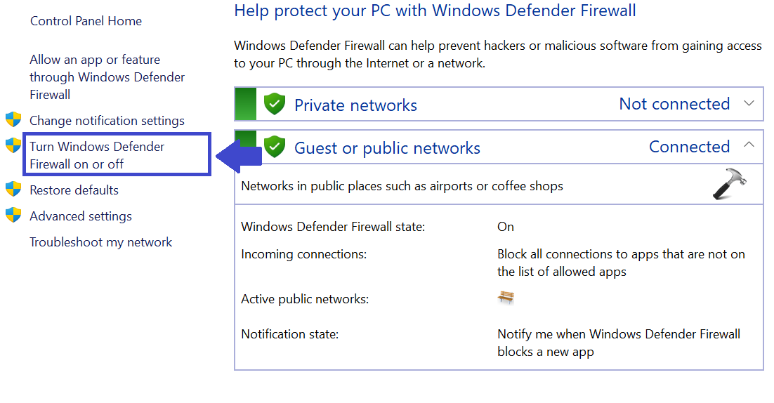 3. Selecteer in het linkerpaneel “Schakel Windows Defender Firewall in of uit“.