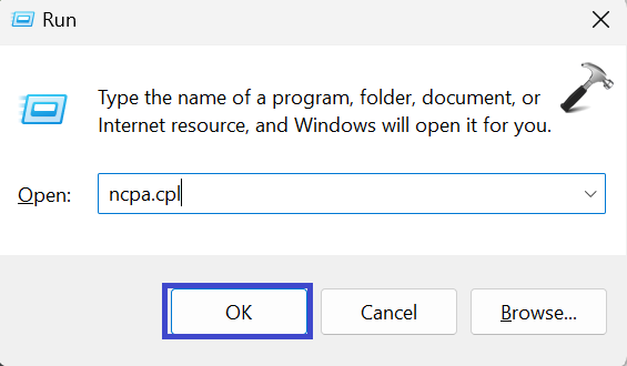 2. Er verschijnt een promptvenster. Typ “ncpa.cpl' en druk op Enter.