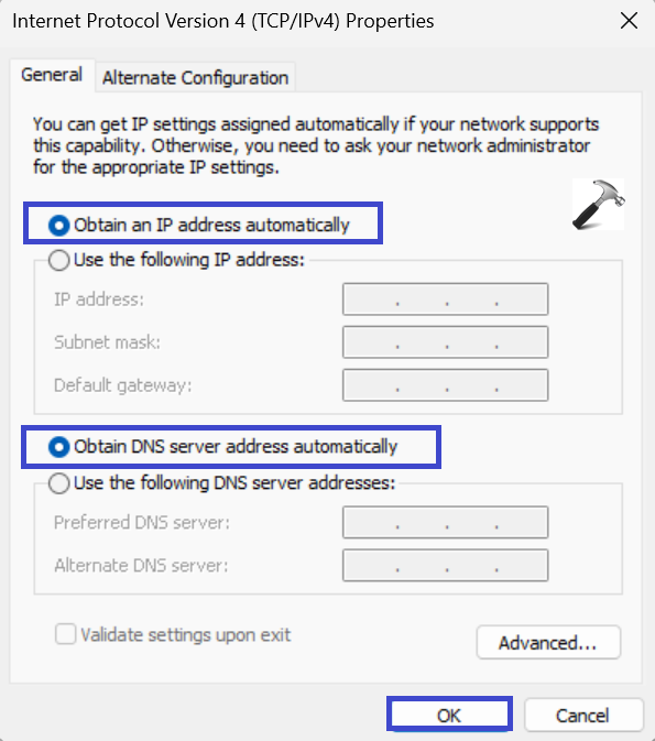 5. Selecteer nu de “Automatisch een IP-adres verkrijgen" En "Automatisch een DNS-serveradres verkrijgenoptie.