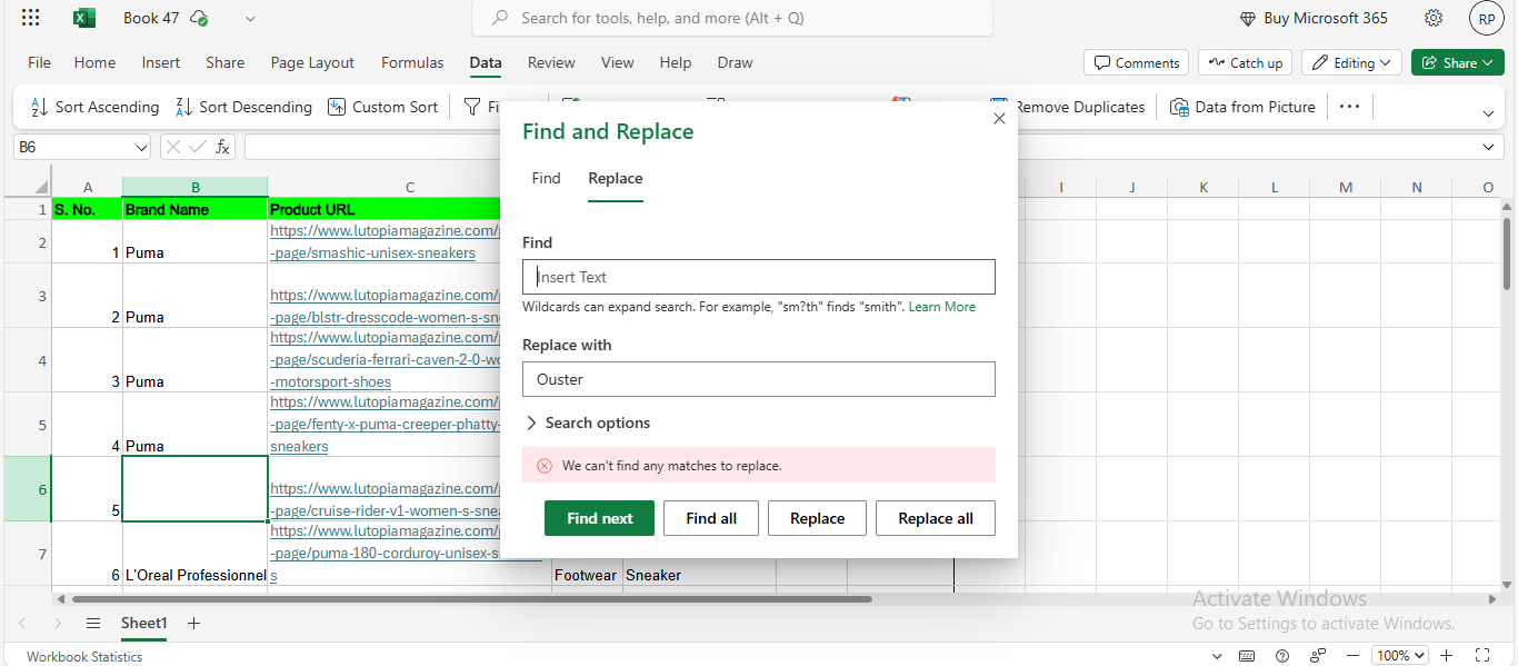 Als u op de optie Alles vervangen of Vervangen drukt zonder de optie Alles zoeken of Volgende zoeken te selecteren, verschijnt er een foutmelding op het scherm met de melding: 'We kunnen geen overeenkomsten vinden om te vervangen'. Om dit probleem te voorkomen, moet u daarom eerst op de knop Alles zoeken of Volgende zoeken drukken voordat u op de knop Alles vervangen of Vervangen drukt.