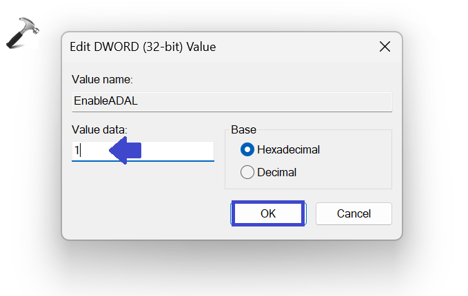 4. Dubbelklik op “ADAL inschakelen” registersleutel en stel de waarde in op 1.
