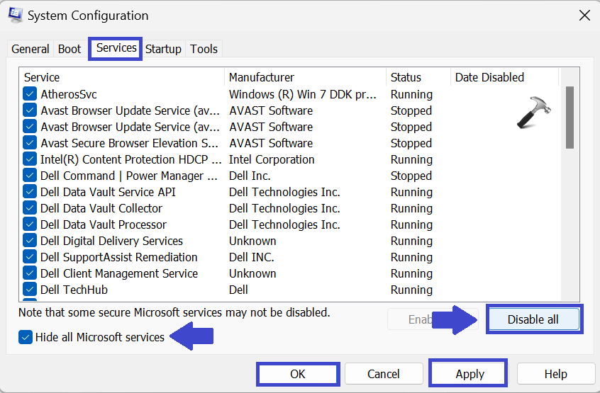 3. Ga nu naar het tabblad "Services" en vink de optie "Alle Microsoft-services verbergen" aan.