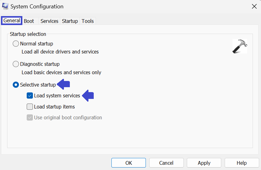 2. Ga naar het tabblad “Algemeen” en selecteer de optie “Selectief opstarten” en de optie “Systeemservices laden”.