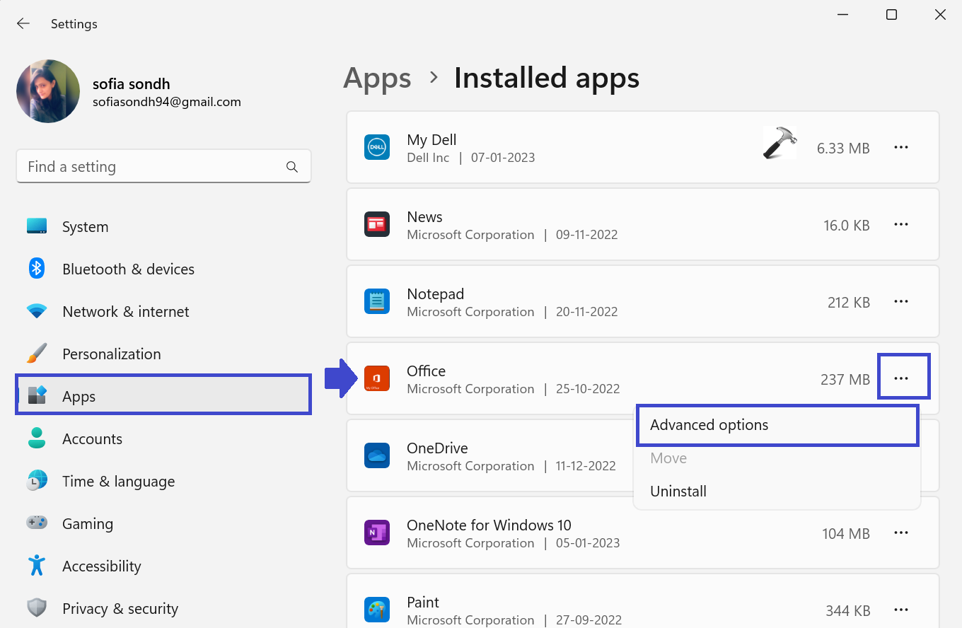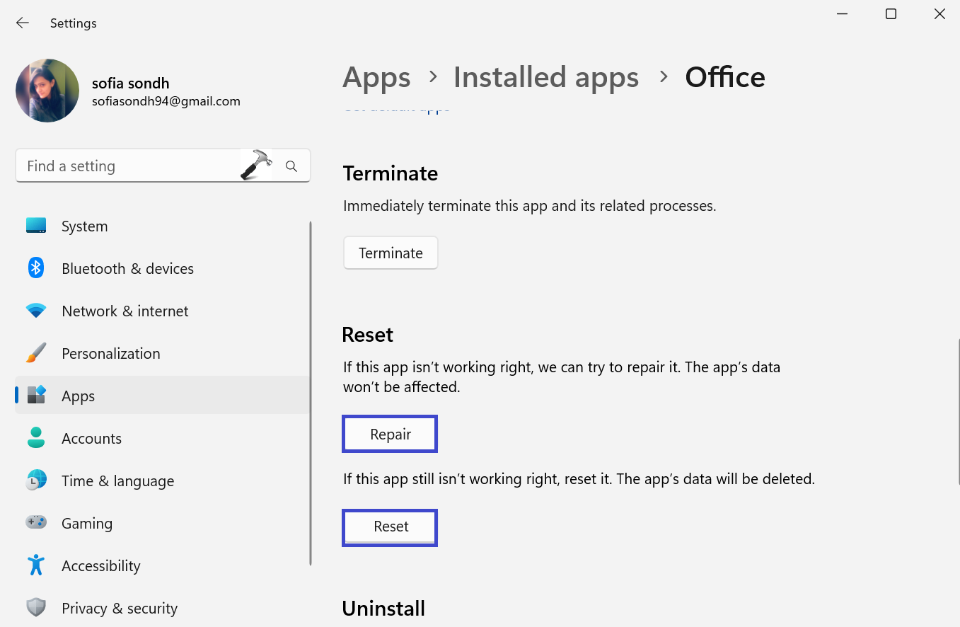 Volg de onderstaande stappen om de foutcode op te lossen door Microsoft Office te repareren en te laten rusten met behulp van de instellingen-app: