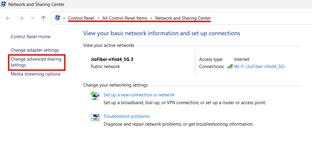 2. Klik op Netwerkcentrum en vervolgens op Geavanceerde instellingen voor delen wijzigen.