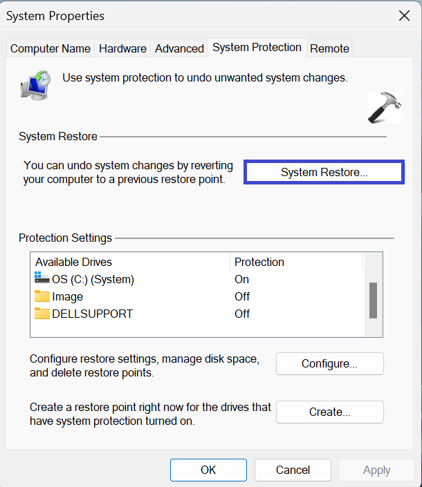 3. Nadat u op “Systeembescherming“, Er verschijnt een promptvenster.