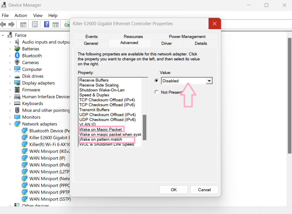 3. Selecteer nu deGeavanceerdtabblad en klik vervolgens opWake on Magic-pakket>Gehandicaptin deWaarde sectie.