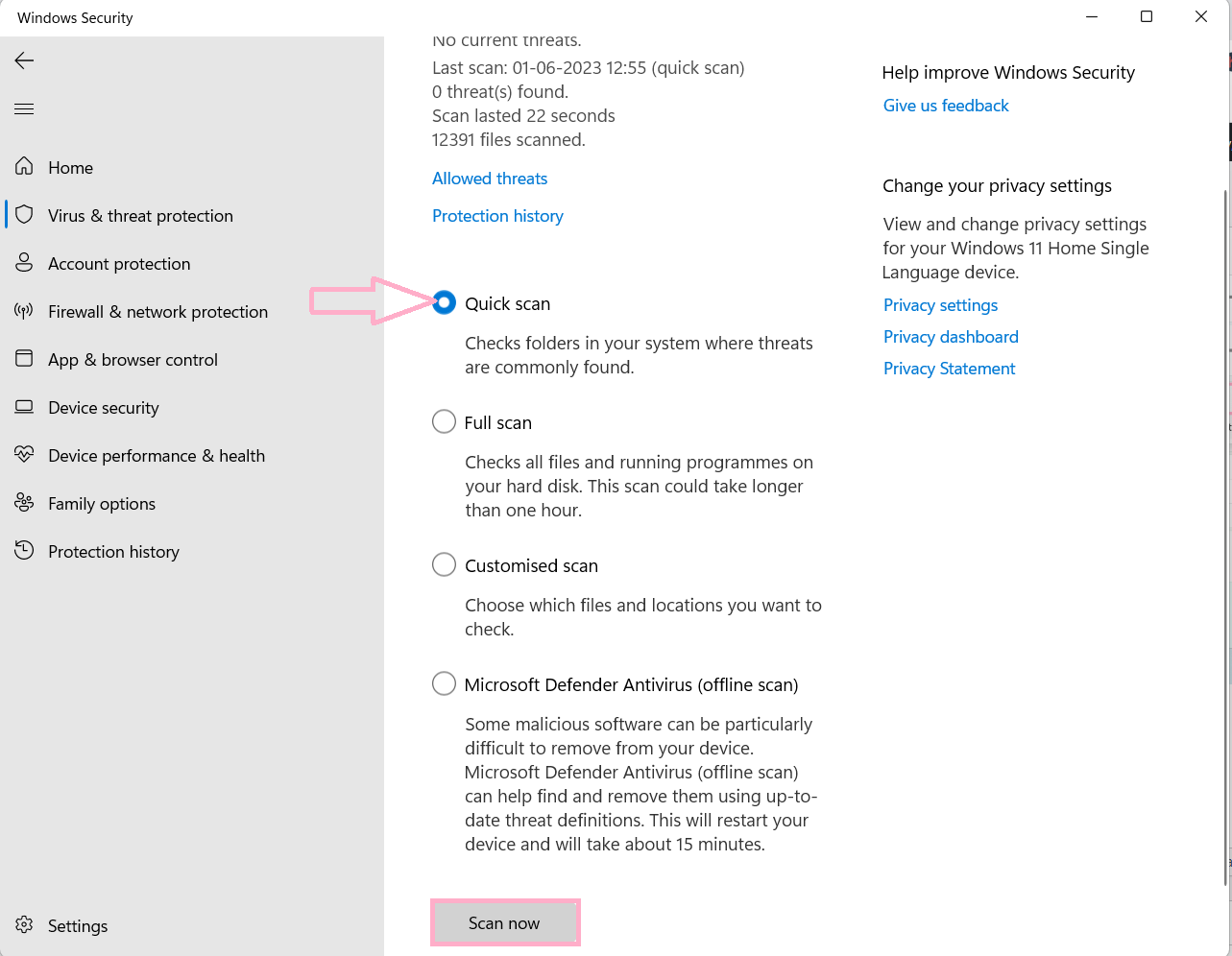 3. Selecteer vervolgensSnelle scankeuzerondje en klik vervolgens opNu scannen.