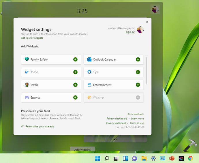 Klik onder Widgetinstellingen opMeld u aflink onder uw Microsoft-account.