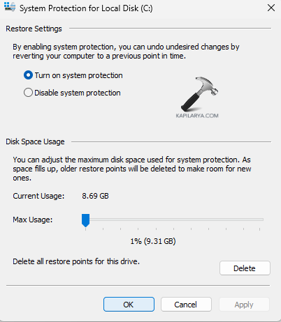 Stap 3-Verplaats nu de schuifregelaar van Maximaal gebruik naar links. Systeemherstel gebruikt minder ruimte om herstelpunten te maken, hoe verder de schuifregelaar naar links staat.