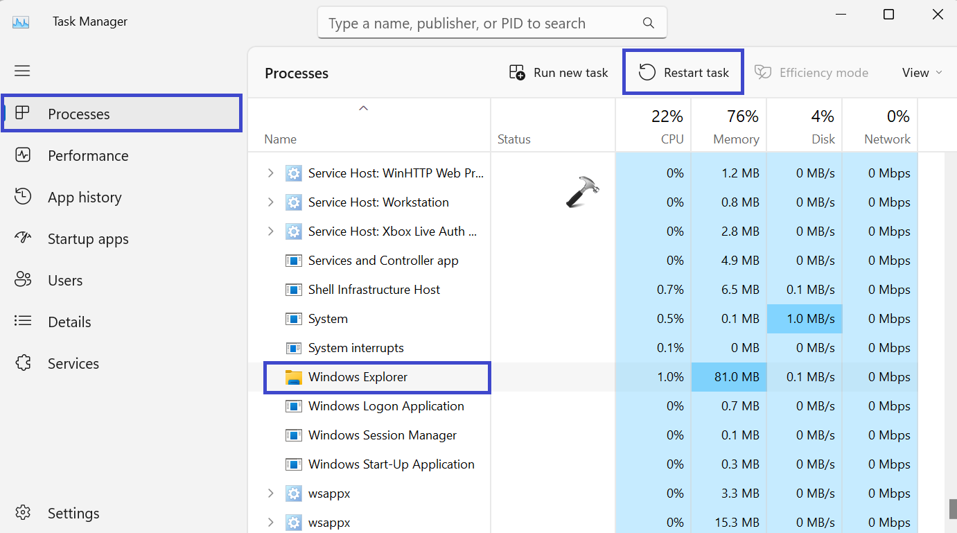 2. Selecteer “Windows Verkenner” en klik op de knop “Opnieuw opstarten”.