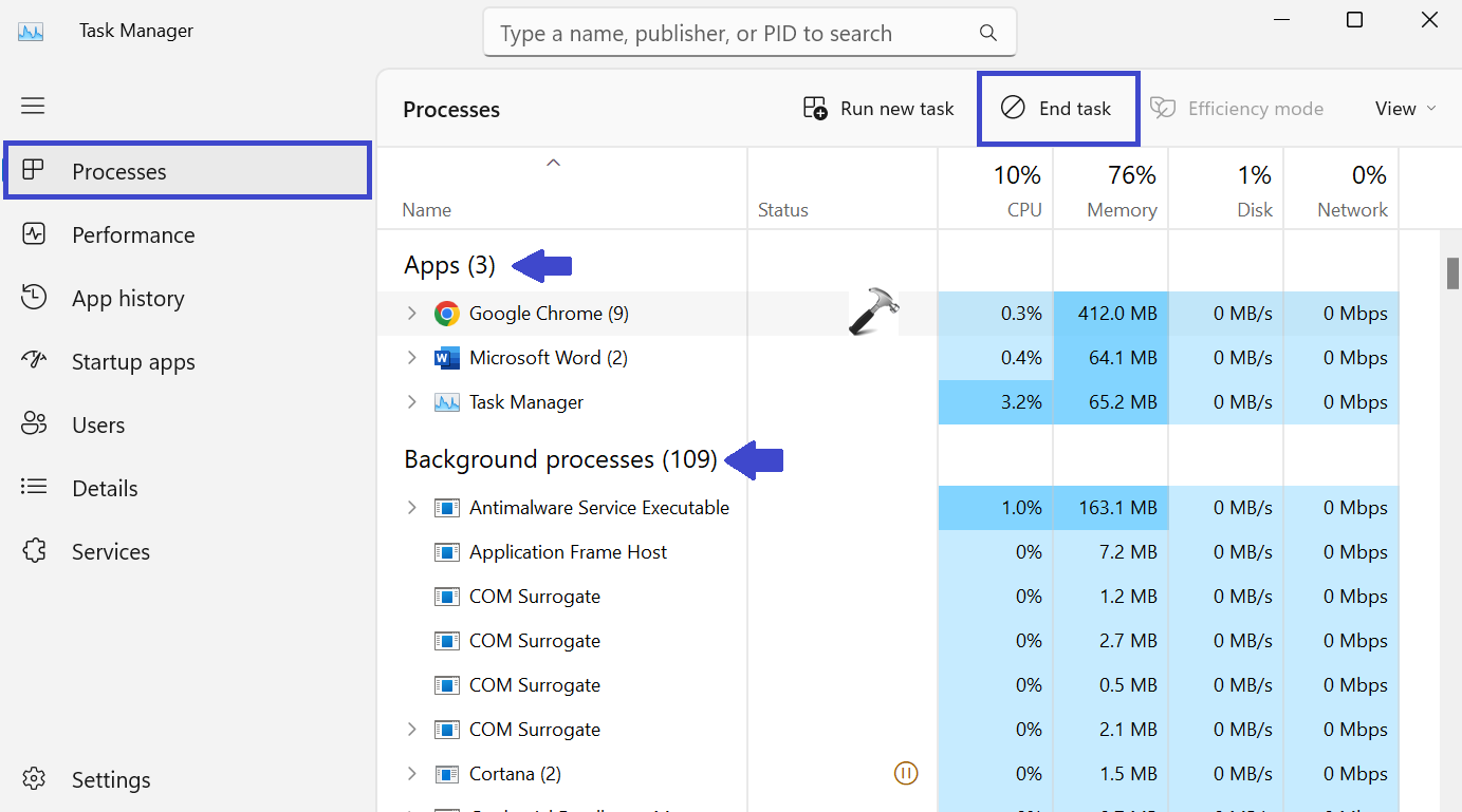 3. Druk daarna op “Taak beëindigen” voor onnodige processen van derden die worden vermeld onder Achtergrondprocessen.