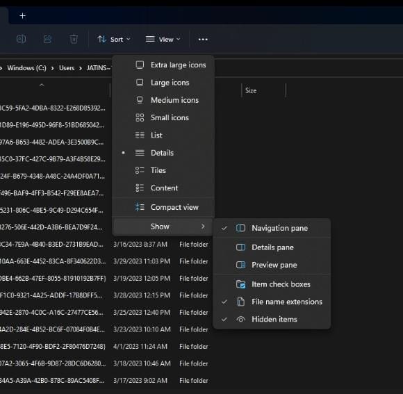 Sommige elementen in de map Thema's zijn mogelijk getranspireerd, dus het kan zijn dat u ze niet allemaal vindt. Selecteer in dat geval ‘Beeld>’ en vervolgens ‘Weergeven’. Kies 'Verborgen items' in het vervolgkeuzemenu.