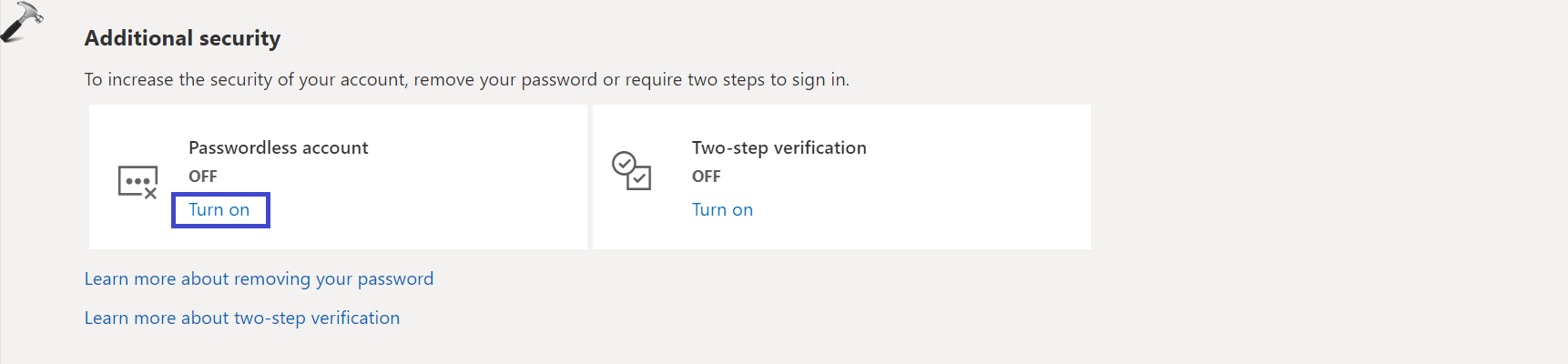 5. Klik onder Extra beveiliging op “Uitschakelen”de “Wachtwoordloos accountoptie.