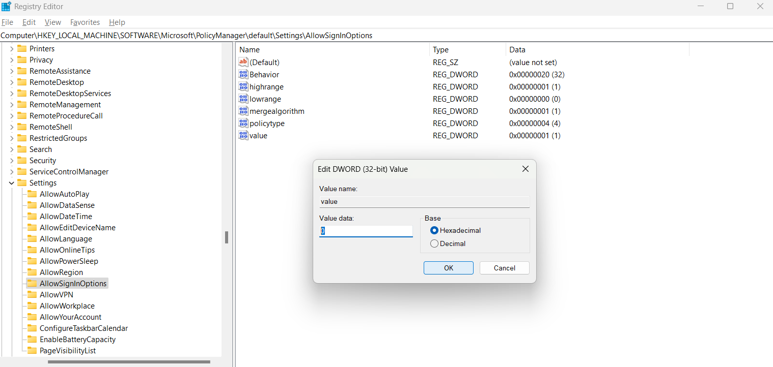 ComputerHKEY_LOCAL_MACHINESOFTWAREMicrosoftPolicyManagerdefaultSettingsAllowSignInOptions