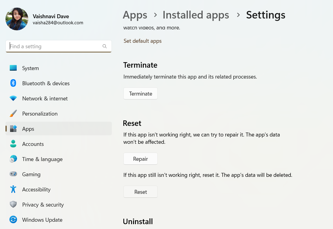 Het probleem kan worden veroorzaakt door beschadigde gegevens of bestanden in de toepassing Instellingen in Windows 11. De oplossing hiervoor is het opnieuw instellen van de app Instellingen. Hier ziet u hoe u het moet doen: