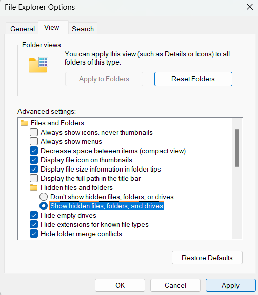 - SelecteerToon verborgen bestanden, mappen en stationshier en klik vervolgens opToepassenEnUitgang.