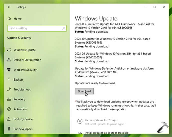 Wanneer u op dit pictogram klikt, gaat u naar het gedeelte Windows Update van de app Instellingen. Hier vindt u dat updates klaar zijn om te downloaden en te installeren. Omdat er updates zijn die nog moeten worden geïnstalleerd, wordt deze fout verwacht. Je kunt gewoon doorklikkenDownloadenknop en voltooi alle updates. Zodra de updates zijn voltooid, verschijnt de fout niet meer.